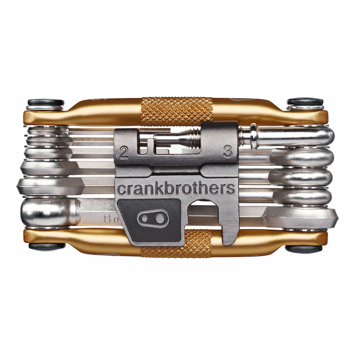 Theย Crank Brothers 17 Function Multi Tool comes equipped with all the essential trailside or roadside tools includingย chain tool: 8/9/10 speed compatible, spoke wrench: #0, 1, 2, 3, hex wrenches: #2, 2.5, 3, 4, 5, 6, 8, open wrench: 8mm, 10mm, screwdrivers: phillips #2, flat #2, torx: t-25.