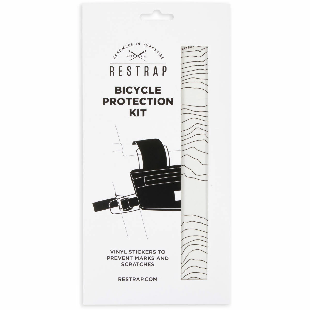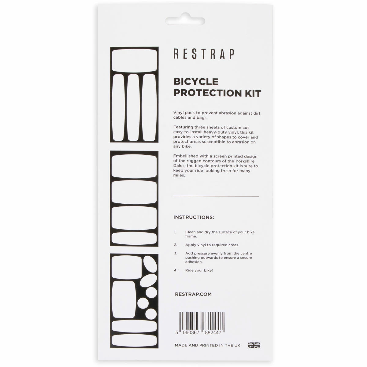 Vinyl pack to prevent abrasion against dirt, cables and bags. Featuring three sheets of custom cut easy-to-install heavy-duty vinyl, this kit provides a variety of shapes to cover and protect areas susceptible to abrasion on any bike. Embellished with a screen-printed design of the rugged contours of the Yorkshire Dales, the bicycle protection kit is sure to keep your ride looking fresh for many miles. Instructions: Clean and dry the surface of your bike frame. Apply vinyl to required areas. Apply some pressure evenly from the centre pushing outwards to ensure secure adhesion. Ride your bike!