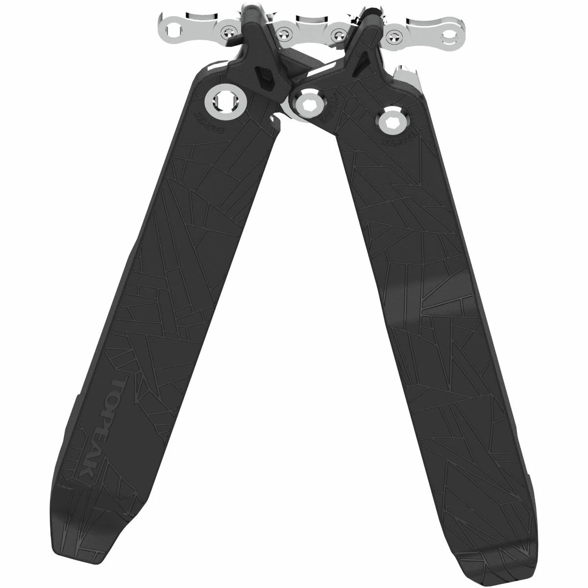 Comprising of two tyre levers that connect to form durable and ergonomic heavy-duty pliers for removing and fitting chain master links (quick links). It also includes an integrated chain hook for efficient chain maintenance a storage compartment for a spare master link. When the two halves are separated, you have tyre levers for quick tyre removal while also featuring a Presta valve core tool.